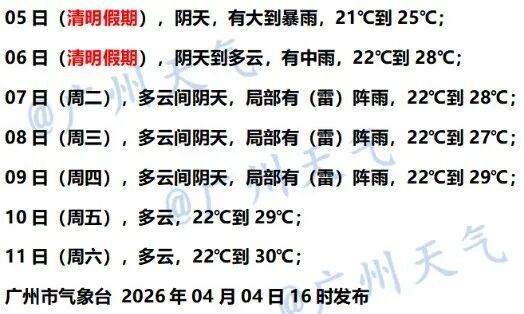 4月5日,粤北、粤东和珠三角市县有大雨到暴雨局部大暴雨,其余市县有(雷)阵雨;部分市县雷雨时伴有8~9级(局地10级)短时大风、短时强降水和局地小冰雹。日间最高气温:雷州半岛31~34℃,粤西其余市县28~30℃,粤东22~24℃,其余市县25~27℃。