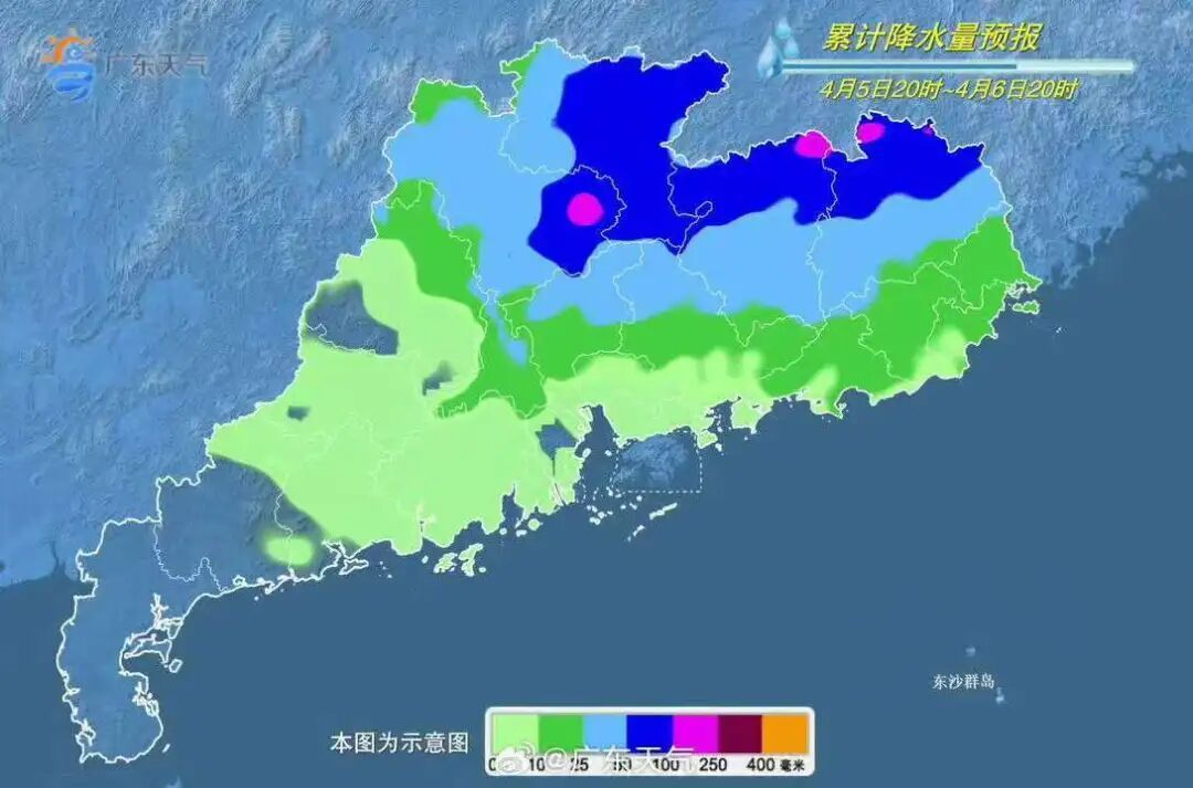 4月5日—6日,粤北、粤东和珠三角市县有大雨到暴雨局部大暴雨,部分市县伴有8~10级短时大风、短时强降水和局地小冰雹。4月7日,全省大部降水明显消弱。