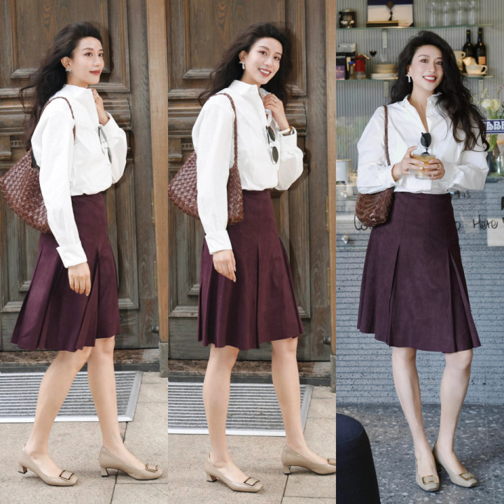 要是小腿的腿型很畅达,这时我们照实可以选用棕色的压褶伞裙来穿搭,裙长刚巧卡在膝盖位置,完好呈现你的腿型,脚踩一对粗跟的浅口单鞋,更显腿长。