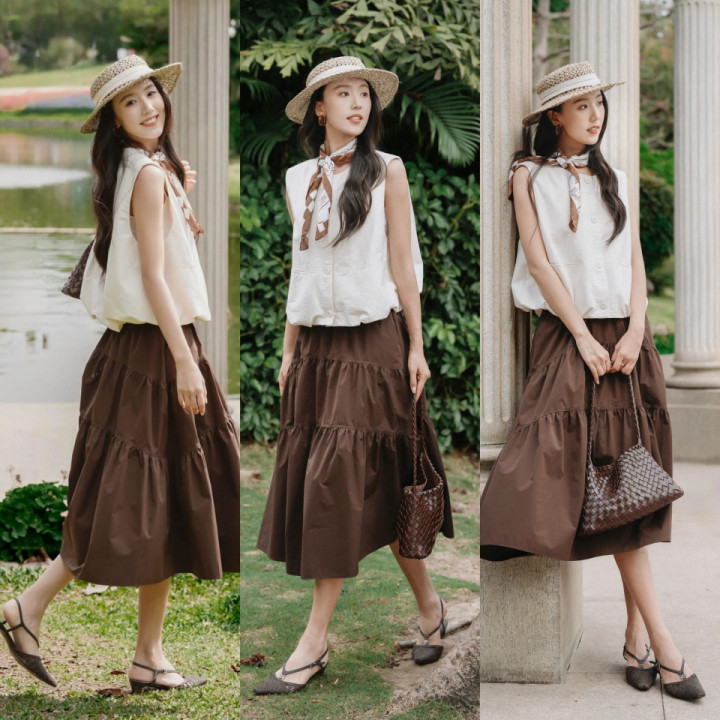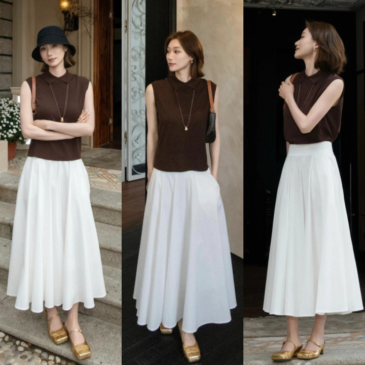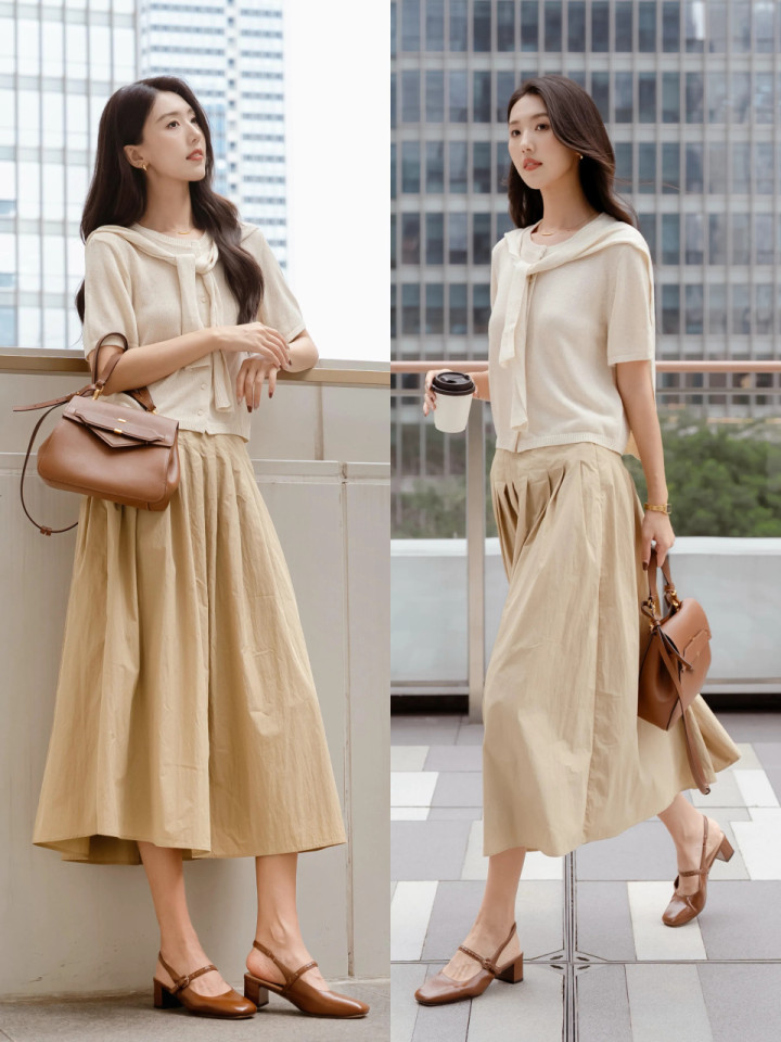Tips③:白色真挚短袖配卡其色伞裙,活力又缜密