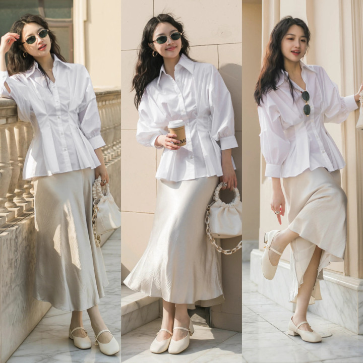 若念念让我方的造型更显高显瘦,这时不妨可以选用小众打算的收腰白色衬衫上衣,配上缎绸面料的高腰伞裙,脚踩一对白色的苏格玛丽珍鞋,就能使得肉体变成三七分比例,显高显瘦。
