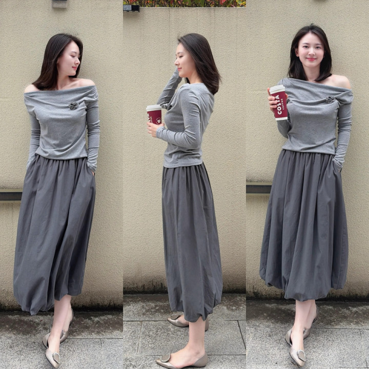 不同的穿着材质配上裙子有着不一样的氛围各异。举例用灰色的一字肩真挚上衣配上灰色的伞裙,脚踩平底单鞋,既缓和又优雅。