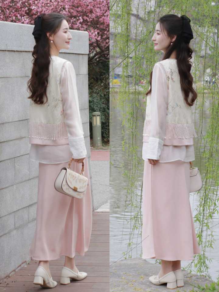要是偏疼缓和甜好意思的穿搭作风,可以选用一条粉色的缎绸面料半裙,配上一件新登科的外衣,内搭白色衬衫,仙女感自显,无须刻意装嫩。