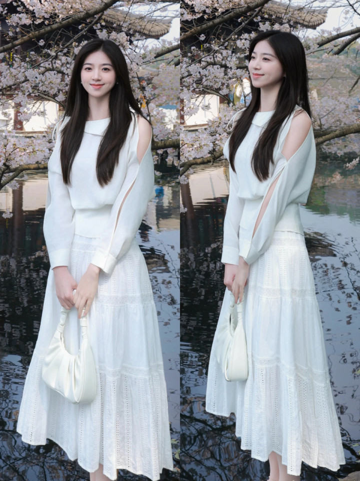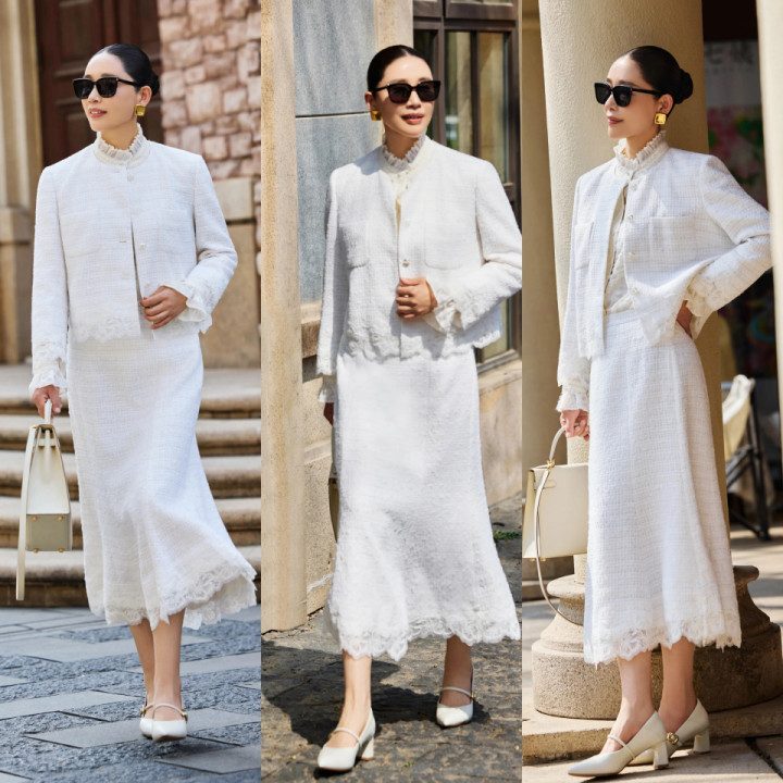 洁白的白就能让东说念主看起来显得很高档,举例上头这一套,用白色小香风裙装,内搭白色木耳边小众衬衫和一对白色粗跟单鞋,自带缜密感。就约略使得穿搭者一霎变得高档优雅。