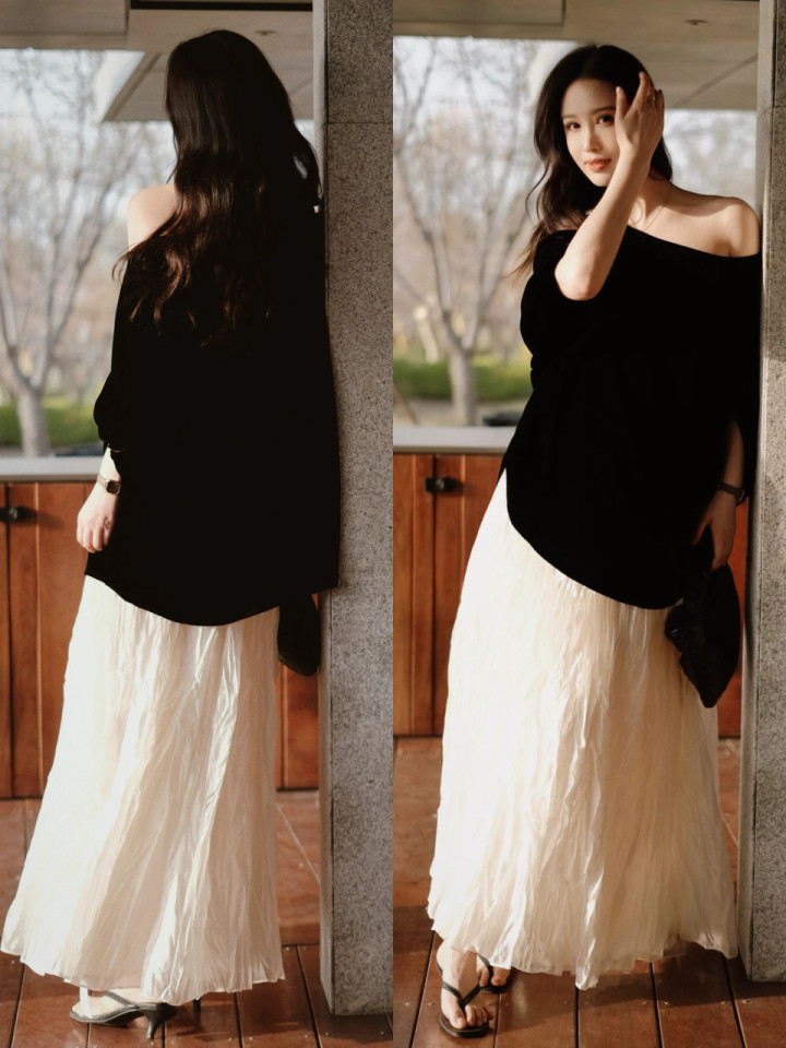 细节③:玄色一字肩上衣+白色薄纱伞裙