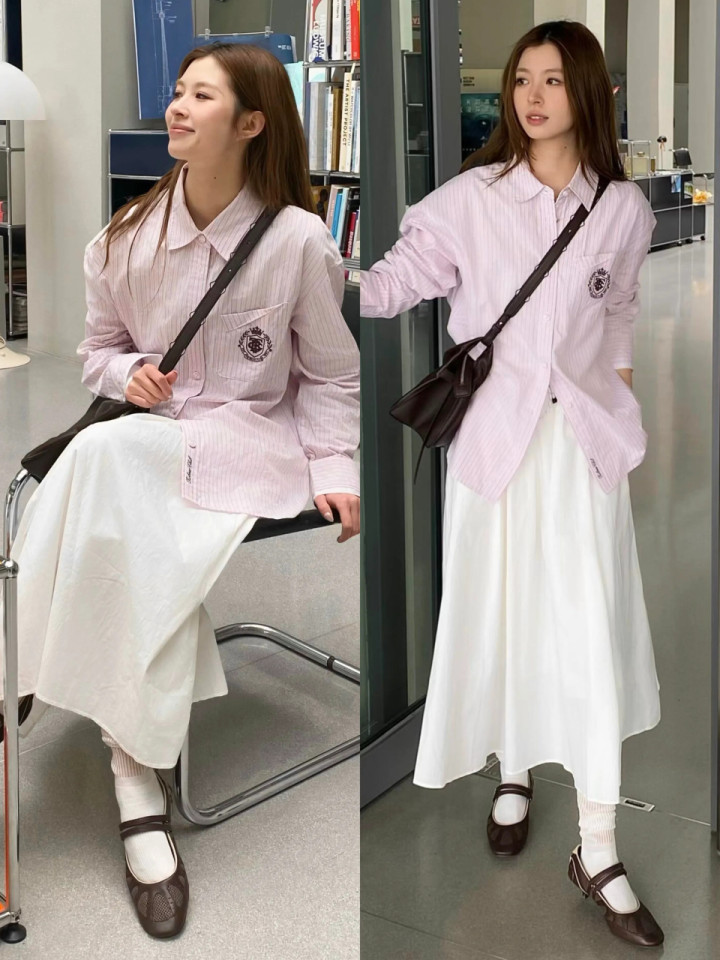举例上头这位达东说念主,选用了一件雾霾蓝的微宽松衬衫,配上白色的伞裙,手里拎着白色的小包,这么的穿衣造型“好意思如初恋”。