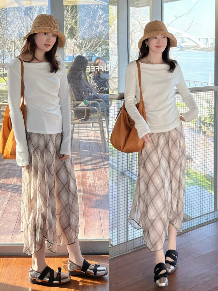 换成一条格纹的薄纱伞裙,配上一件白色的真挚上衣,这么的穿搭灵动又有仙女感,可盐可甜,清闲随心。
