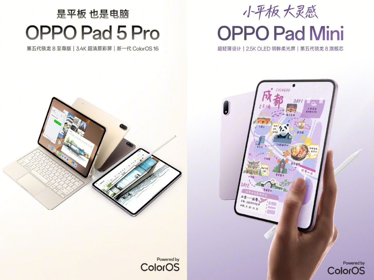 本次发布会同步亮相的两款旗舰平板,诀别以旗舰性能与浮滑体验完善OPPO高端生态布局。OPPO Pad 5 Pro搭载13.2英寸3.4K超清原彩大屏与13380mAh超大容量电板,依托第五代骁龙8至尊版的强盛性能,在多任务并行不停、移动办公、高清影音文娱、影像后期剪辑等场景中均能发达沉稳。OPPO Pad Mini则以浮滑便携策画为特质,搭载第五代骁龙8移动平台,配备2.5K 144Hz OLED明眸柔光屏,8.8英寸的机身仅重279g,并融入旗舰级畅通体验,兼顾随身文娱、轻量办公与超长续航,全面掩饰用户各种化的使用场景。