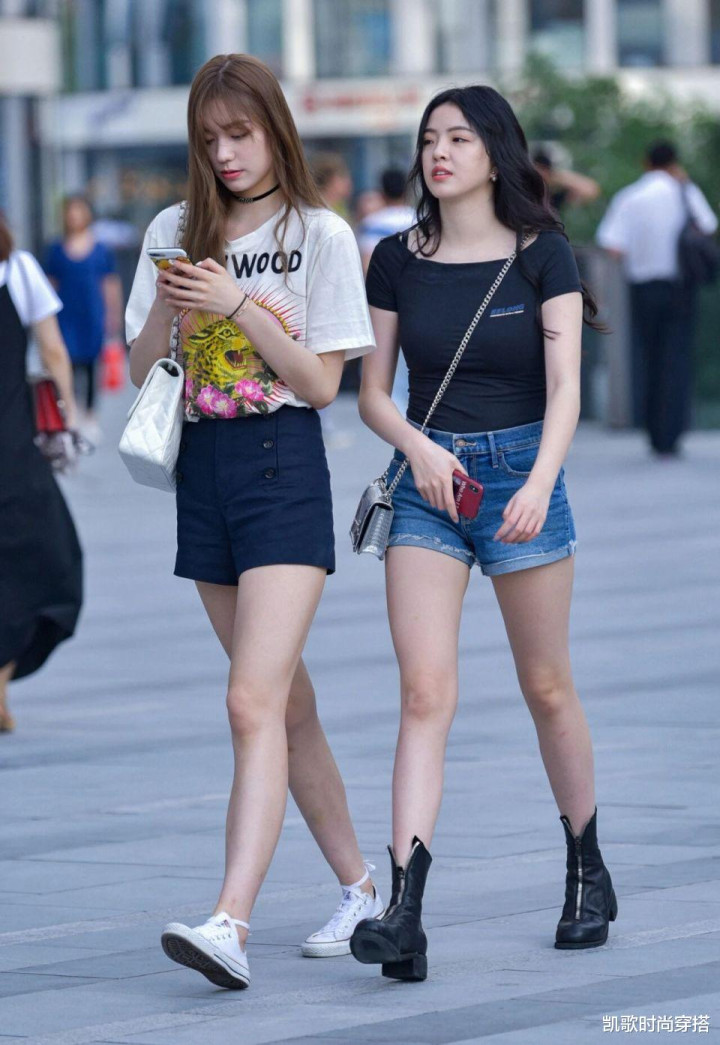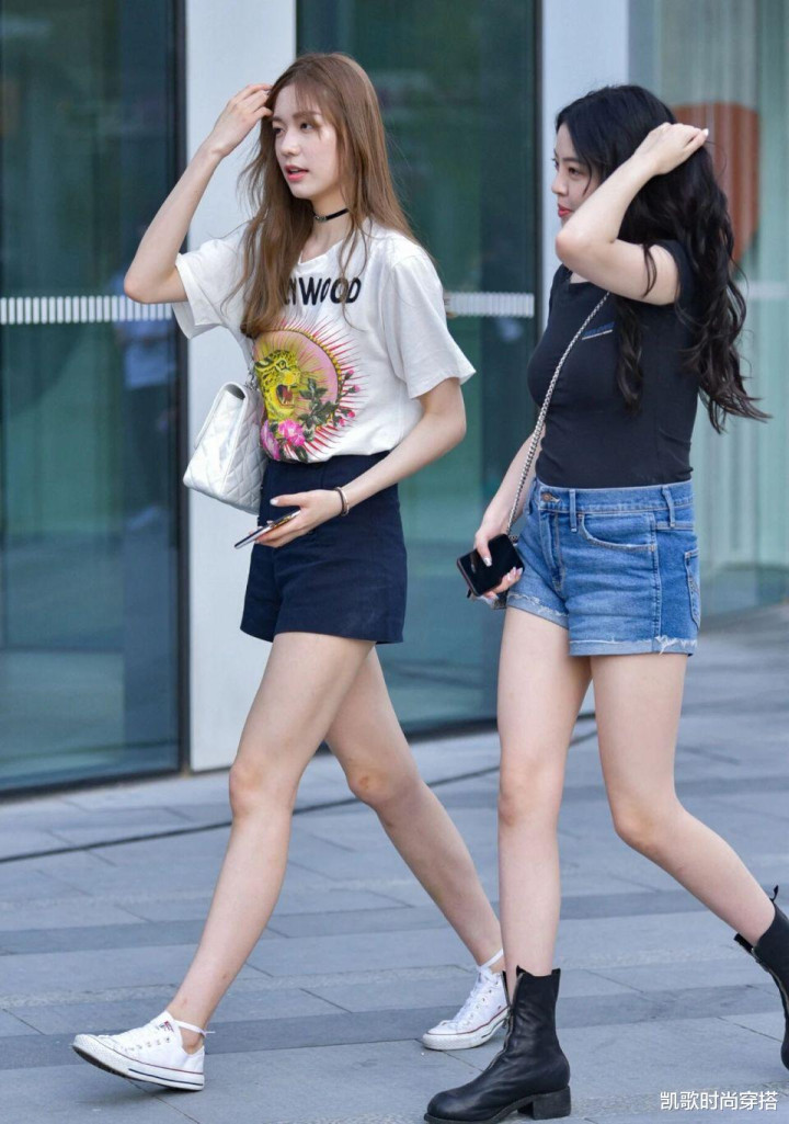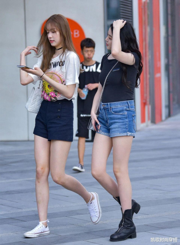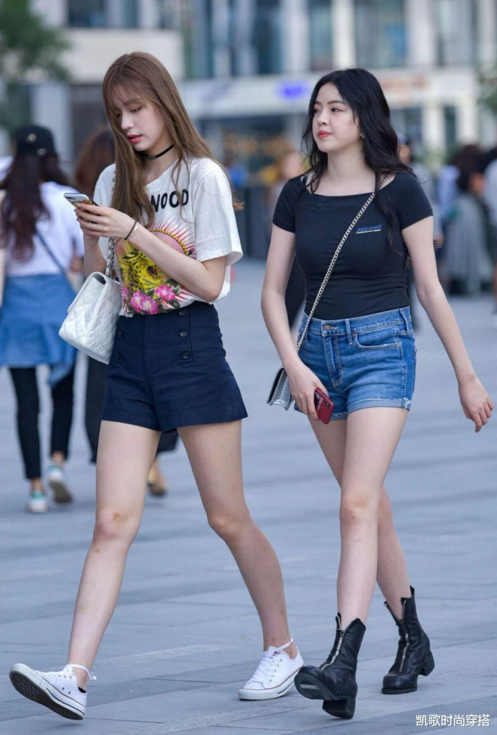 瞧,图中的两位女生,她们的穿搭就极为合适夏天外出。两东说念主真的都弃取了短款穿搭,看上去凉爽闲暇又不失机尚有型。念念必她们往往一同逛街,况且对神采搭配颇有心得。只见她们折柳身着一件白色和玄色的 T 恤衫,T 恤衫算作众人流行的衣饰单品,受众平庸,不管长幼皆可衣着。