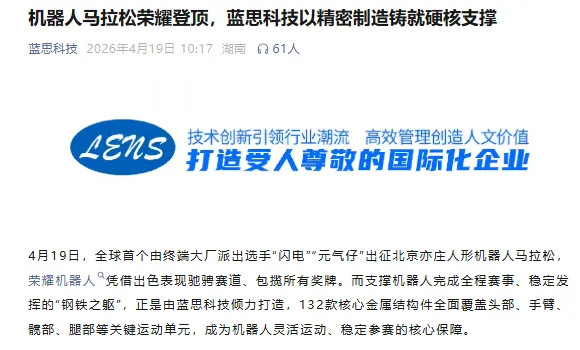 音信面上,4月19日,2026北京亦庄半程马拉松暨东谈主形机器东谈主半程马拉松圆满完了。深圳荣耀灵敏科技修复有限公司都天大圣队的“闪电”机器东谈主夺冠并糟塌东谈主类半程马拉松记录。