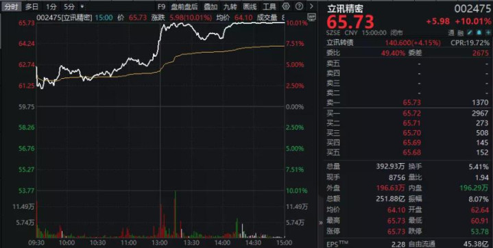 20日午后,耗尽电子龙头立讯精密(002475)涨幅进一步扩大,并于尾盘胜仗封住涨停,以251.88亿元的成交额位居全市集榜首。