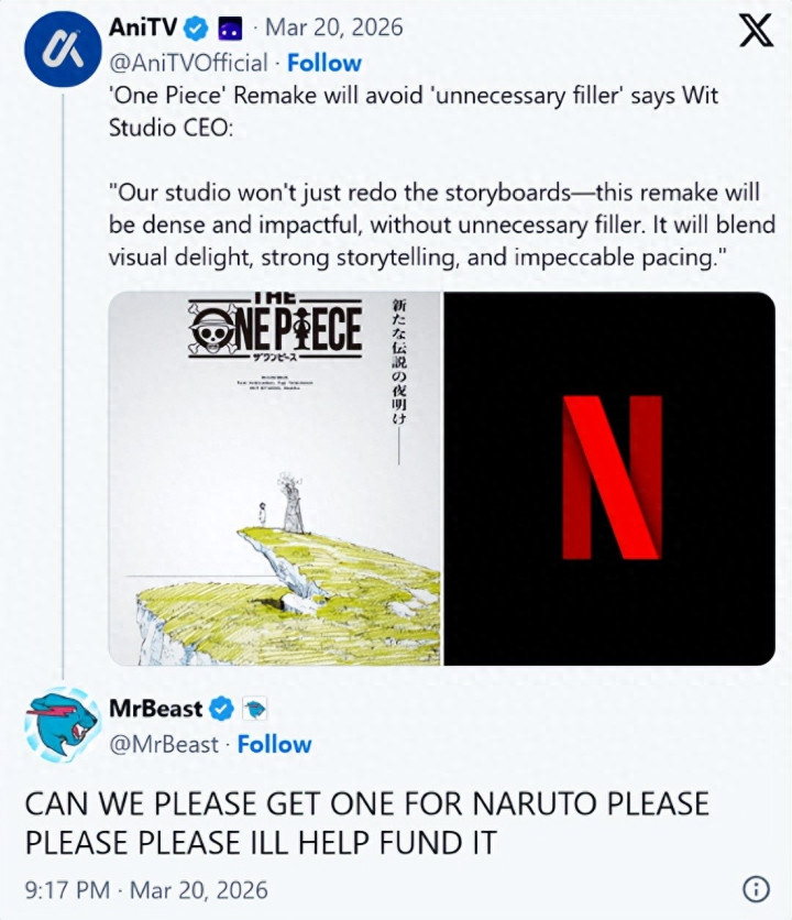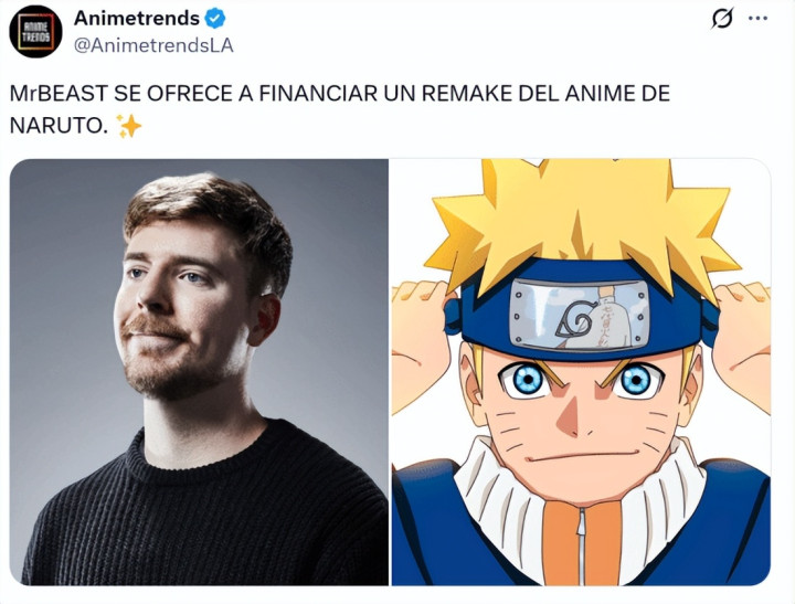 这两天公共最顶流的视频创作家MrBeast,公开辟了一句话“能不可给《火影忍者》也来一个重制?求求了,我不错出钱。”