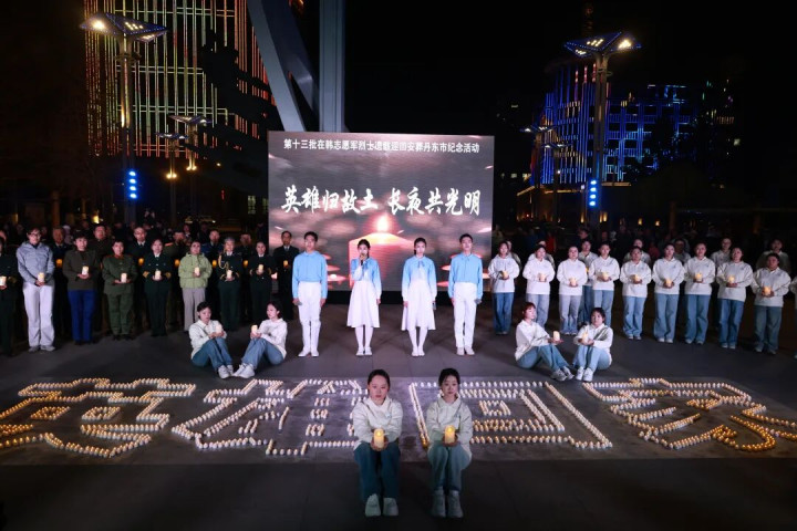 4月20日晚,在丹东市和平广场,各界代表参加烛光精致念活动,招待志愿军义士“回家”。曹舒昊摄