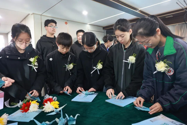 4月21日,江祭英烈活动现场,港澳台学生将写给志愿军战士的信叠成千纸鹤。曹舒昊摄