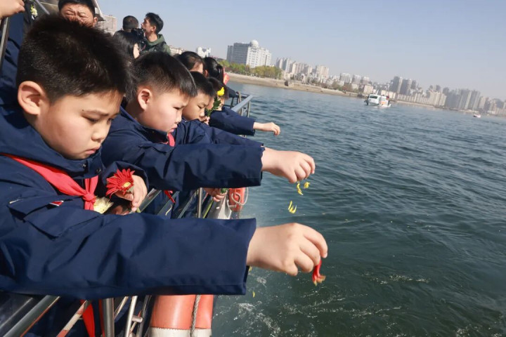 4月21日上昼,在丹东参加江祭英烈活动的江苏泰兴根念念履行学校少先队员在江面撒下花瓣,录用哀念念。曹舒昊摄