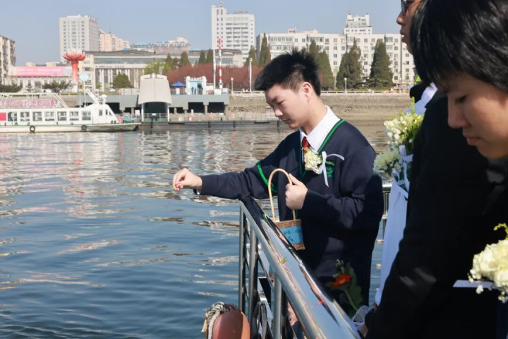 船舷边,万子晴和同学们将千纸鹤、花瓣插足江水,录用对英烈的哀念念。