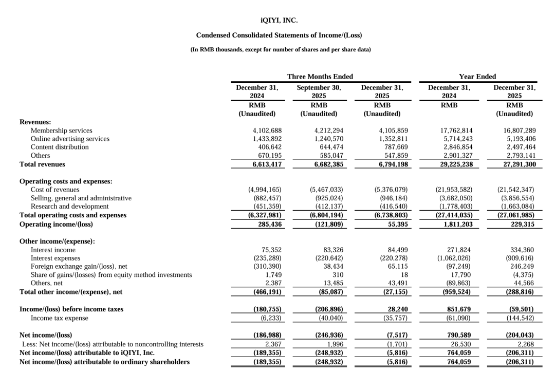 不外,本钱管控的收效未能对消营收下滑的影响,2025年爱奇艺盈利洽商出现显豁恶化。
