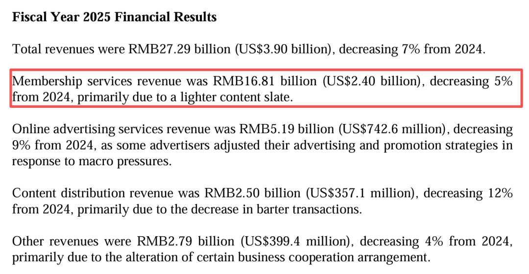 更愁的是会员工作的下滑。财报清爽,2025年其会员工作收为168.1亿元,同比下滑5%。四肢第二大板块,在线告白工作相似濒临下滑压力,2025年营收为51.9亿元,同比下滑9%。
