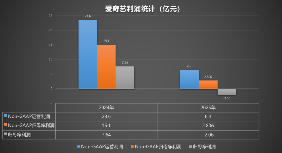 爱奇艺诚然理解4年杀青运营盈利,2025年Non-GAAP运谋利润为6.4亿元,不外较2024年的23.6亿元下滑约73%,Non-GAAP包摄于爱奇艺的净利润2.806亿元,2024年为15.1亿元,而包摄于爱奇艺的净利润则由盈转亏,2025年包摄于爱奇艺净吃亏为2.06亿元,2024年同期为净利润7.64亿元。