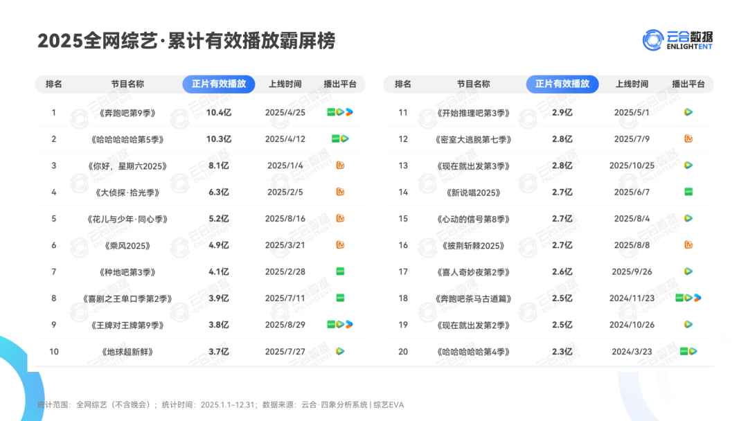 而2025年全网聚积综艺有用播放霸屏榜前10部综艺中,爱奇艺独播的《种地吧3》《笑剧之王单口季2》上榜,有用播放量别离为4.1亿和3.9亿。不外,四肢“综N代”,两个IP续作播放量均有所下滑,2024年《种地吧2》和《笑剧之王单口季》播放量别离为5.6亿和4.7亿。