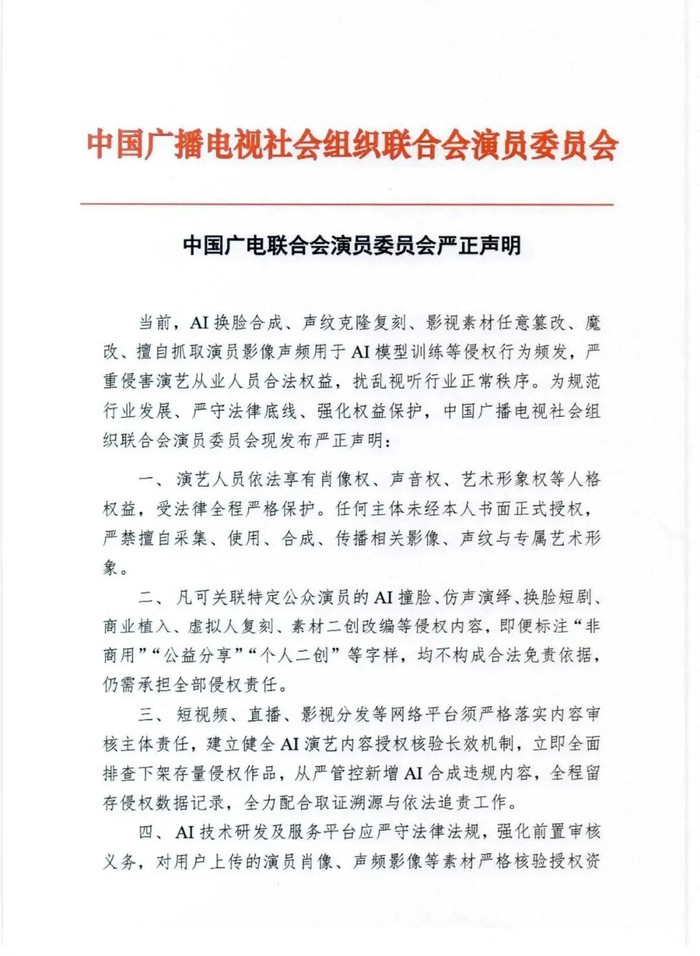 “中国广电连续会演员委员会”微信公号音书:现时,AI换脸合成、声纹克隆复刻、影视素材任性改削、魔改、私自捏取演员影像声频用于AI模子查验等侵权举止频发,严重侵害演艺从业东说念主员正当权力,搅扰视听行业日常递次。为措本质业发展、严遵法律底线、强化权力保护,中国播送电视社会组织连续会演员委员会现发布严正声明。