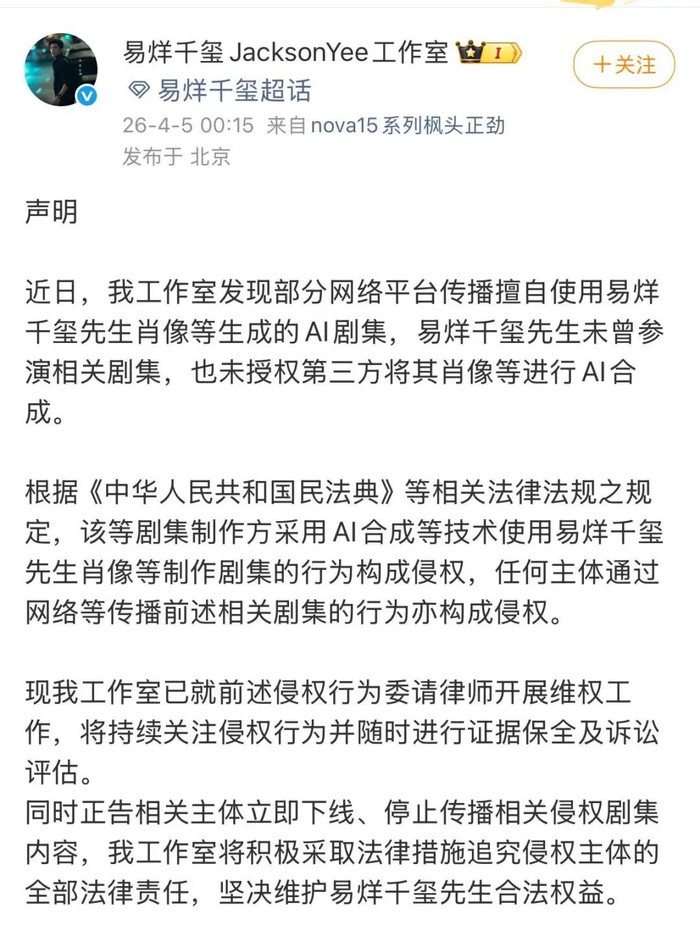 4月5日凌晨,易烊千玺责任室发布声明称,近日发现部分收集平台传播私自使用易烊千玺先生肖像等生成的AI剧集,易烊千玺先生未尝参演干系剧集,开云app官方也未授权第三方将其肖像等进行AI合成。现已就前述侵权举止委请讼师开展维权责任,开云体育(kaiyun)官方网站同期正告干系主体立即下线、罢手传播干系侵权剧集实质。